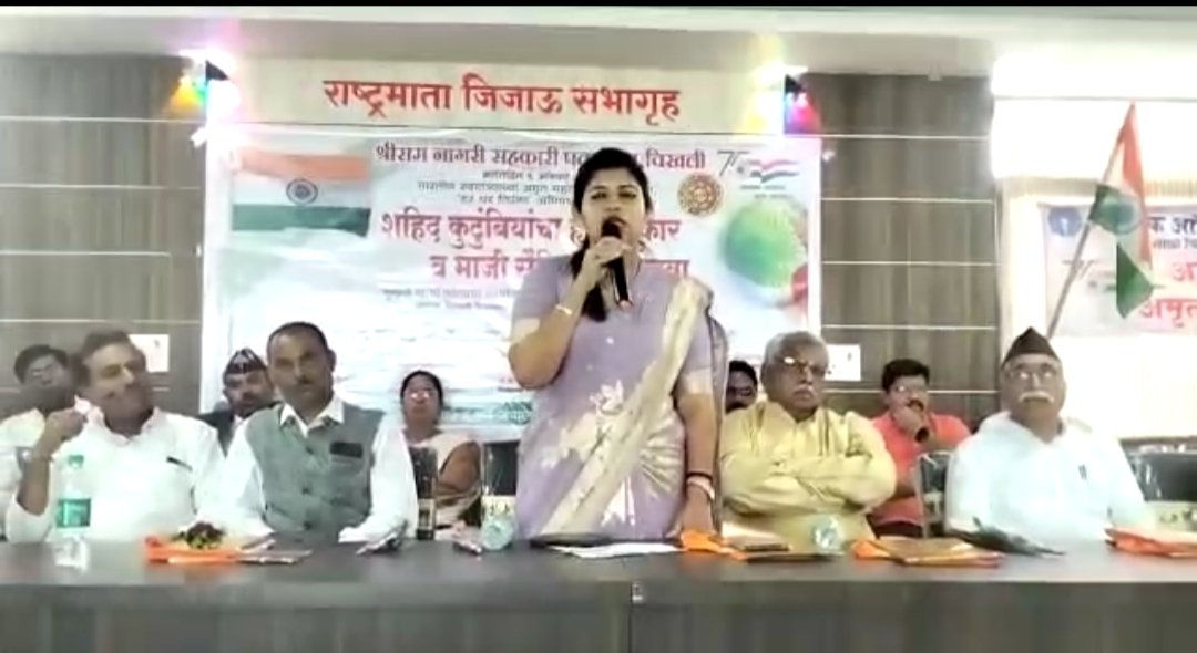 श्रीराम नागरी सहकारी पतसंस्थेच्या वतीने दि. ९ आँगस्ट रोजी स्वातंत्र्याच्या अमृत महोत्सवानिमित्त क्रांती दिनाचे औचित्य साधून शहिद जवानांच्या कुटुंबियांचा सत्कार आ. श्वेताताई महाले यांच्या हस्ते करण्यात आला. या प्रसंगी प्रमुख भाषण करताना त्या बोलत होत्या. जिजाऊ इंग्लिश मिडीयम स्कूलमध्ये आयोजित या कार्यक्रमाच्या अध्यक्षस्थानी सैनिक फेडरेशनचे जिल्हाध्यक्ष श्रीकृष्ण बंगाळे हे होते तर प्रमुख पाहुणे म्हणून सतीश गुप्त, अध्यक्ष चिखली अर्बन बँक, अँड. विजय कोठारी, अध्यक्ष अंबिका अर्बन सोसायटी, रामकृष्णदादा शेटे अध्यक्ष शिक्षण प्रसारक मंडळ, सुरेशअप्पा खबुतरे ज्येष्ठ नेते भाजपा, ज्येष्ठ नेते प्रकाश महाराज जंजाळ, रामदासभाऊ देव्हडे, अँड. मंगेश व्यवहारे अंकुशराव पाटील, शेख अनीस जिल्हाध्यक्ष भाजपा अल्पसंख्यांक आघाडी, सुनीताताई भालेराव, शहराध्यक्ष भाजपा महिला मोर्चा, कृष्णकुमार सपकाळ भाजपा तालुकाध्यक्ष, शिवराज पाटील, भारतीय स्टेट बँकेचे शाखाधिकारी राजेश कुळकर्णी व त्रिदल सैनिक सेवा संघाचे तालुकाध्यक्ष रामेश्वर सोळंकी यांची उपस्थिती होती.