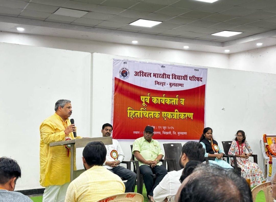 MH 28 News Live / चिखली : गेल्या ७६ वर्षांपासून शैक्षणिक क्षेत्रात विद्यार्थ्यांच्या समस्या घेऊन लढणारी जगातील सर्वात मोठी विद्यार्थी संघटना असलेल्या अखिल भारतीय विद्यार्थी परिषदेचे ध्येय हे शैक्षणिक क्षेत्राबरोबरच राष्ट्रीय पुनर्जागरण करणे हे असून या ध्येयाच्या प्राप्तीसाठी जुन्या कार्यकर्त्यांनी नव्या पिढीला मार्गदर्शन व सहकार्य करावे असे आवाहन अभावीपचे राष्ट्रीय सहसंघटन मंत्री देवदत्त जोशी यांनी केले. स्थानिक आदर्श विद्यालयात सुरू असलेल्या विदर्भ प्रदेश अभ्यासवर्गानिमित्त दि. १९ जून रोजी आयोजित पूर्व कार्यकर्ता एकत्रिकरणास मार्गदर्शन करताना ते बोलत होते. याप्रसंगी मंचावर विदर्भ प्रांत मंत्री पायल किनाके, पूर्व कार्यकर्ता संमेलनाचे संयोजक सुधीर कुळकर्णी, चिखली नगर अध्यक्ष डॉ. पंकज शेटे, बुलढाणा चिखली भाग प्रमुख कु.अमृता गुप्ता यांची उपस्थिती होती.