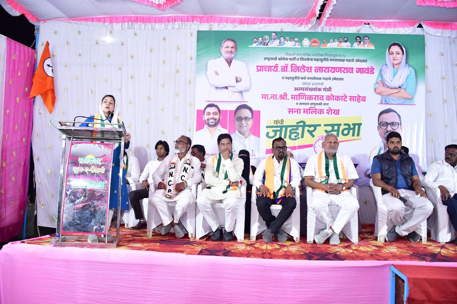 चिखली नगरपरिषद निवडणुकीच्या नगराध्यक्ष पदासाठी राष्ट्रवादी काँग्रेस – शिवसेना युतीचे उमेदवार म्हणून प्राचार्य डॉ. निलेश गावंडे हे मैदानात उतरले आहेत. त्यांना सर्व धर्मीय मतदारांकडून व्यापक प्रतिसाद मिळत आहे. प्राचार्य गावंडे यांच्या प्रचारासाठी राष्ट्रवादी काँग्रेस पक्षाच्या आमदार सना मलिक व राज्याचे अल्पसंख्यांक विकास मंत्री माणिकराव कोकाटे यांची जाहीर सभा २८ नोव्हेंबर रोजी आयोजित करण्यात आली होती. याप्रसंगी मंचावर राष्ट्रवादी काँग्रेसचे जिल्हा उपाध्यक्ष मनोज दांडगे, तालुकाध्यक्ष संतोष परिहार, मीनल गावंडे, राजू गवई, दत्ता खरात, तुषार बोंद्रे, सुभाष देवडे, संतोष लोखंडे, डॉ नितीन पाटील, राजू रज्जाक, करामत भाई, रिकी काकडे, शेखर बोंद्रे, व्यंकटेश बोंद्रे, दिलीप मेहेत्रे यांच्यासह राष्ट्रवादी काँग्रेस व शिवसेनेचे पदाधिकारी उपस्थित होते.